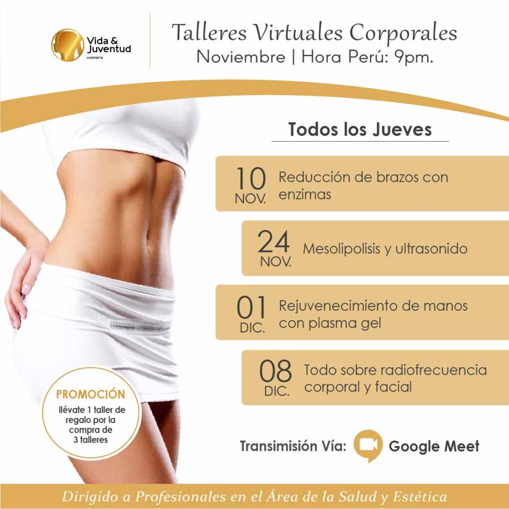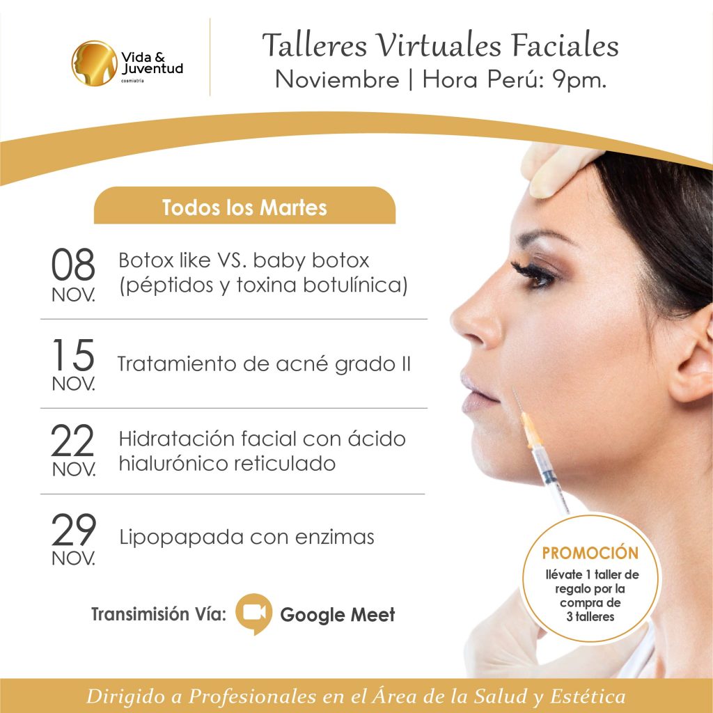 Programación de talleres virtuales faciales y corporales con práctica demostrativa. Dirigido a Profesionales en Estética y Área de la Salud.
