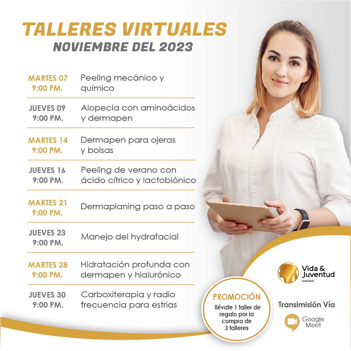 Programación de talleres virtuales faciales y corporales con práctica demostrativa. Dirigido a Profesionales en Estética y Área de la Salud.