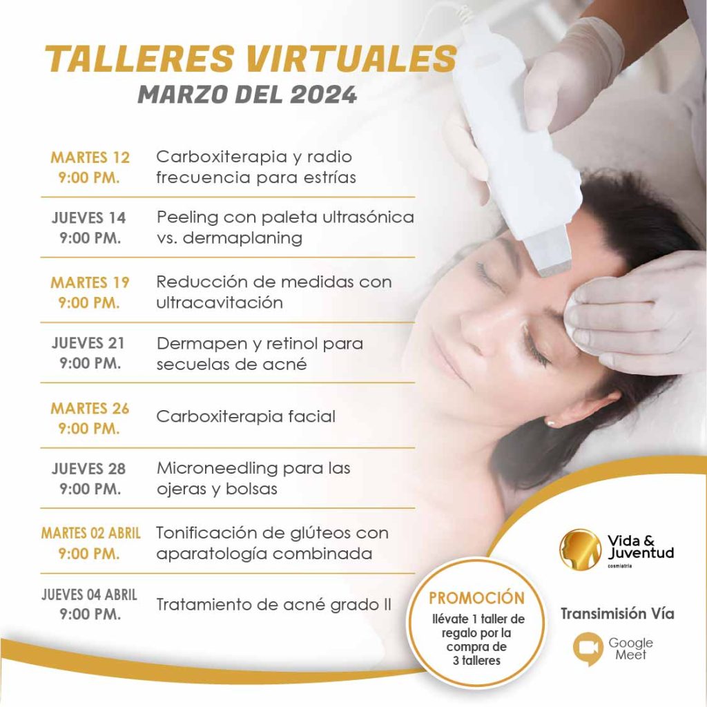 Programación de talleres virtuales faciales y corporales con práctica demostrativa. Dirigido a Profesionales en Estética y Área de la Salud.